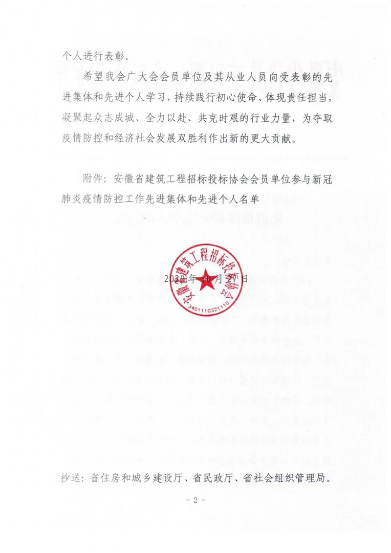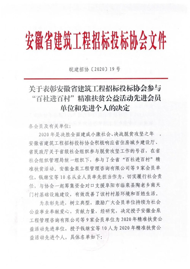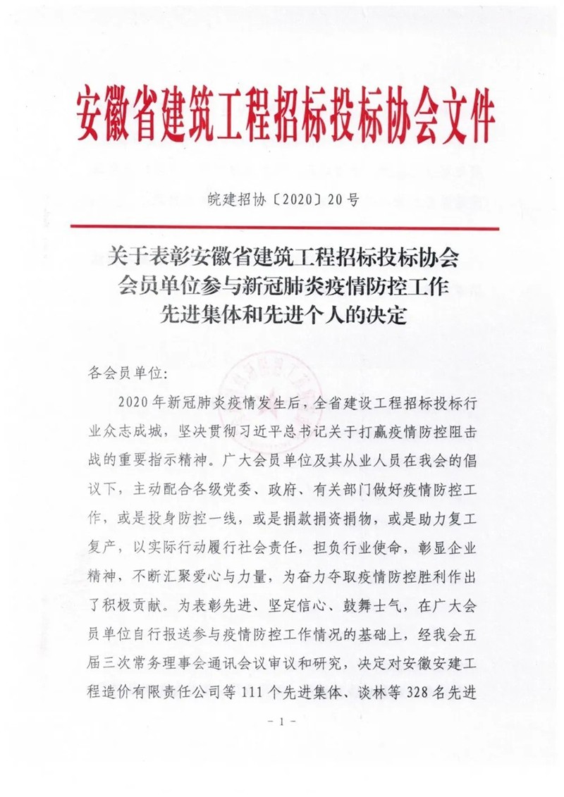 为表彰先进,树立典型,激励企业持续不断为社会公益事业奉献爱心。近日,安徽省建筑工程招标投标协会表彰了一批《参与“百社进百村”精准扶贫公益活动先进会员单位和先进个人》及《参与新冠肺炎疫情防控工作先进集体和先进个人》。我司均榜上有名,这充分展现了我司的社会责任和担当。