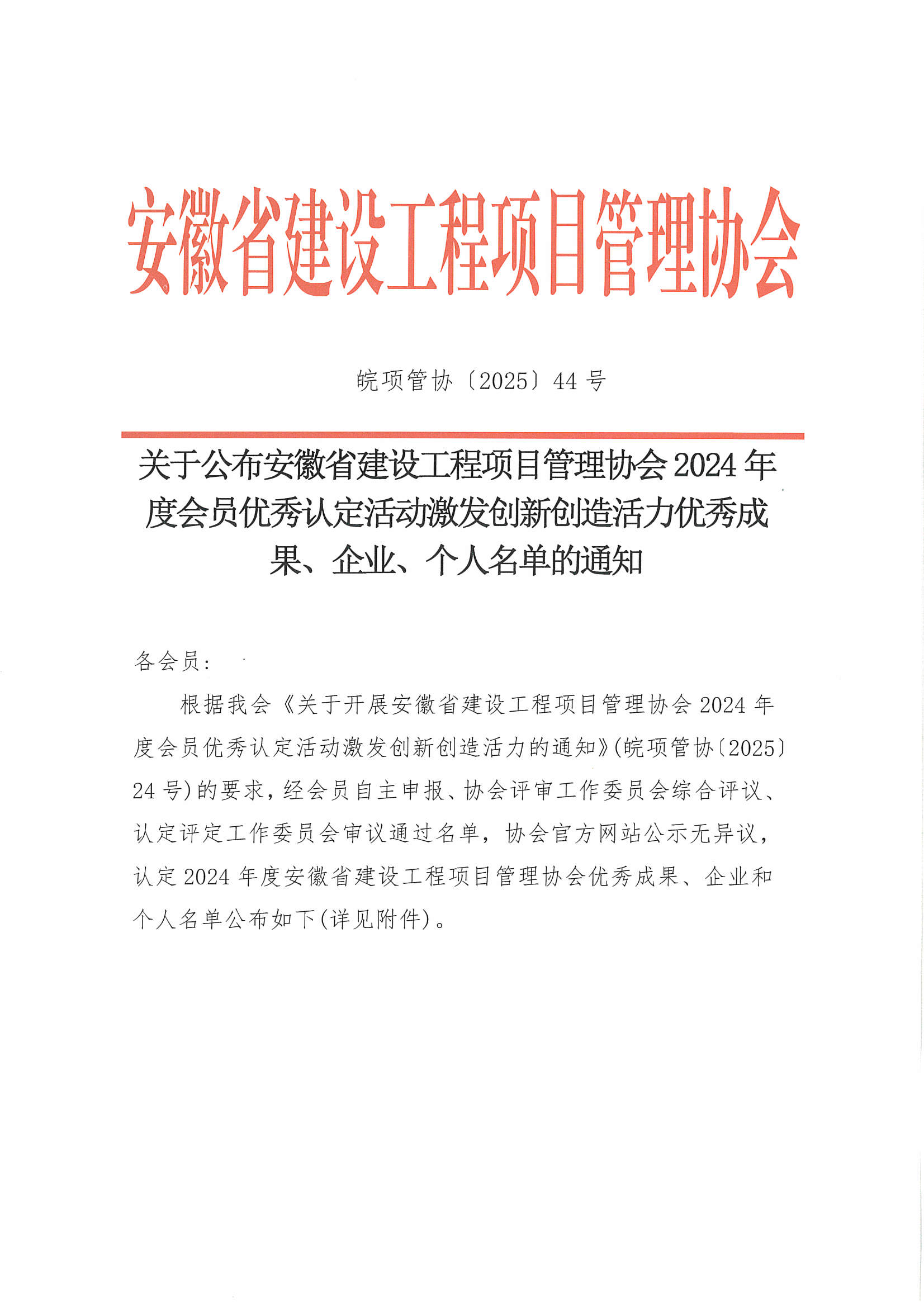 近日,安徽省建设工程项目管理协会发布了《关于公布2024年度会员优秀认定活动激发创新创造活力优秀成果、企业及个人名单的通知》。我司凭借出色的技术实力与突出的创新能力,荣获“优秀全过程工程咨询企业”“优秀工程监理企业”“优秀造价咨询企业”“优秀皇冠博彩企业”“优秀勘察设计企业”“优秀工程咨询(投资)企业”等多项企业荣誉。同时,我们还有多类优秀项目成果和优秀个人获得表彰,累计共40项荣誉。这一系列沉甸甸的荣誉,是对我司全过程工程咨询能力与专业人才梯队建设成果最有力的证明!